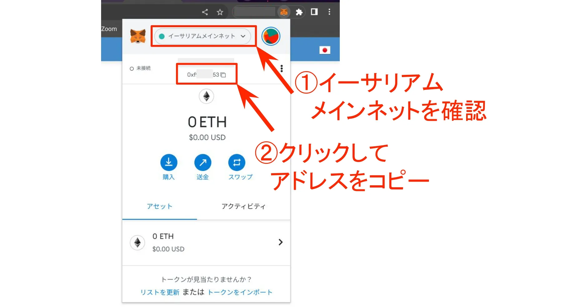 以上で、メタマスクのウォレットアドレスがコピーできました。