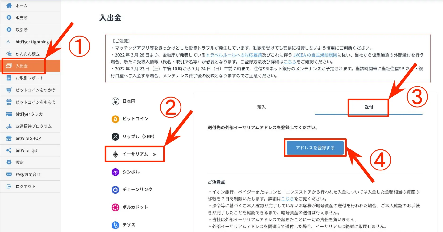 【手順2】ビットフライヤーにウォレットアドレスを登録