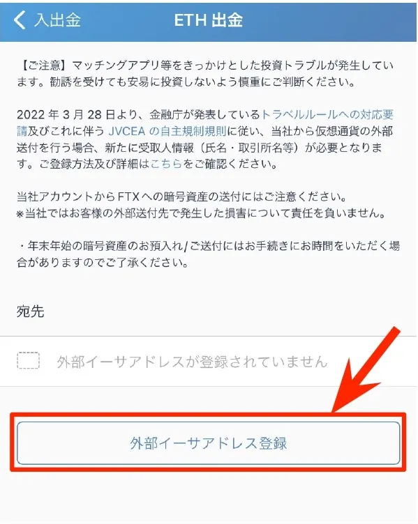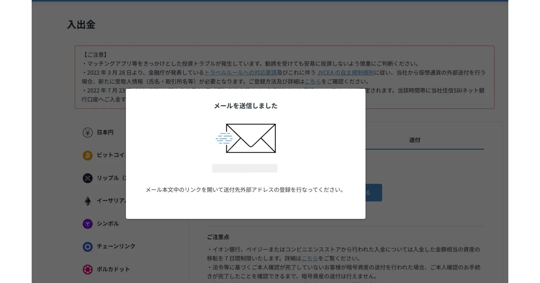 金融庁が発表しているトラベルルールに基づき、仮想通貨を外部のウォレットに送金する場合は、送金先の情報を入力する必要があります。