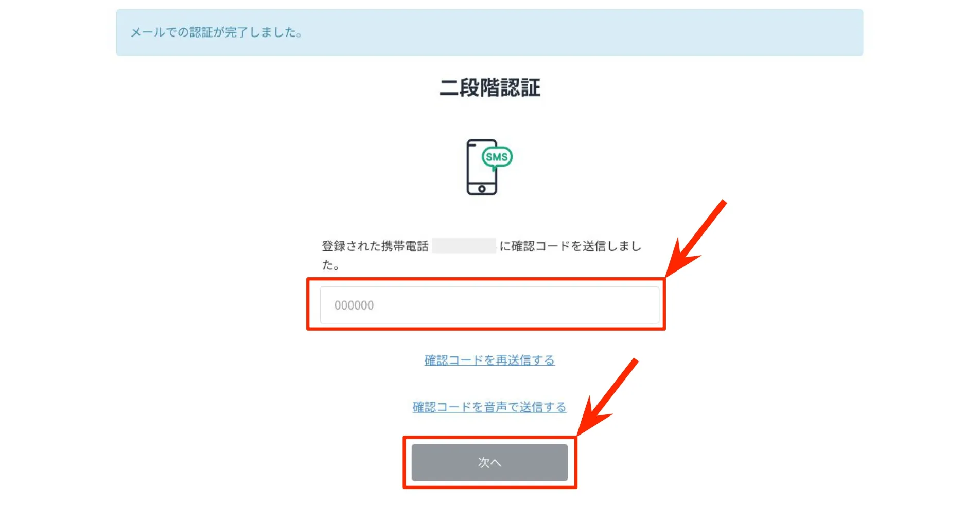スマホに届いた認証コードを入力して「次へ」をクリックします。