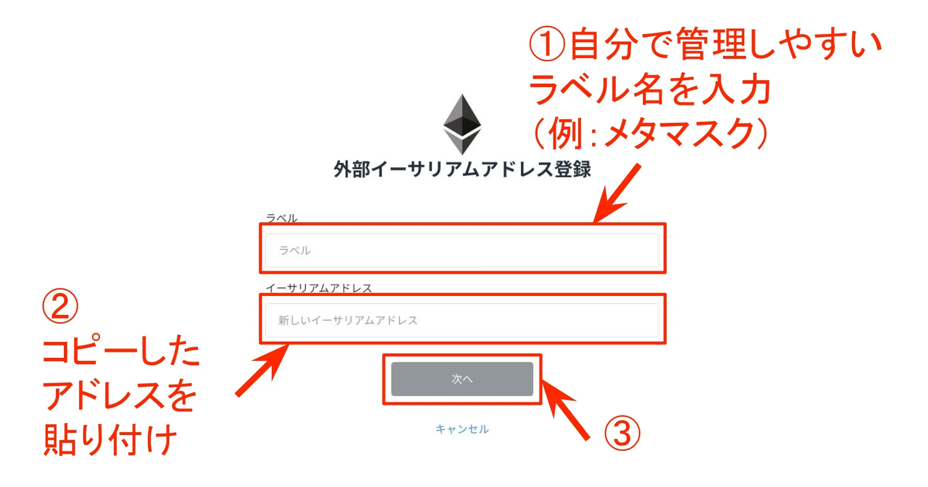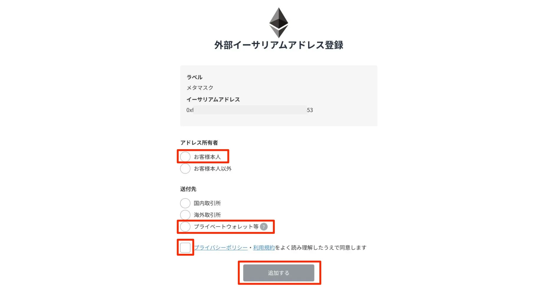 ここでメタマスクのウォレットアドレスを登録します。手順は以下のとおりです。