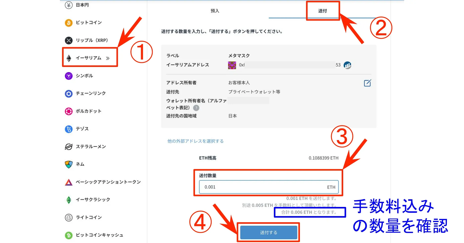 - イーサリアムを選択(送付する仮想通貨を選択)