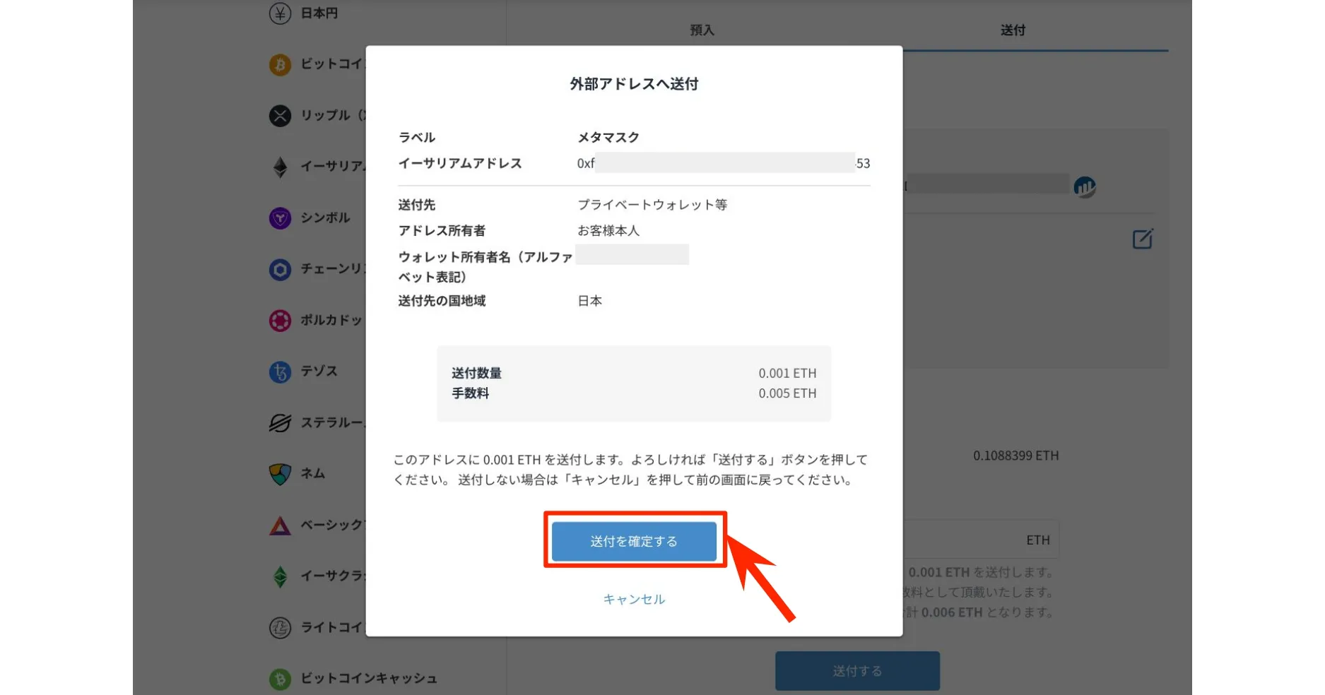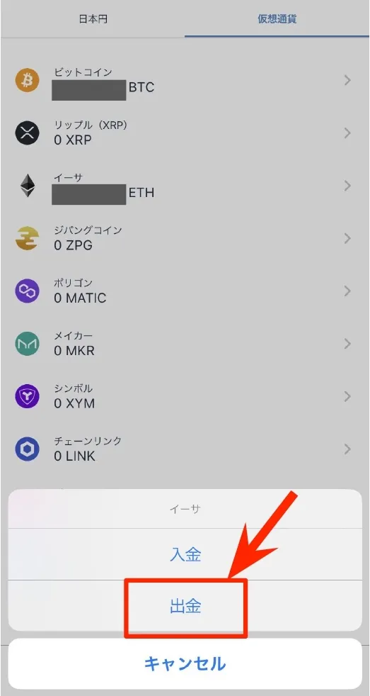 - 「イーサリアム」を選択(送付する仮想通貨)