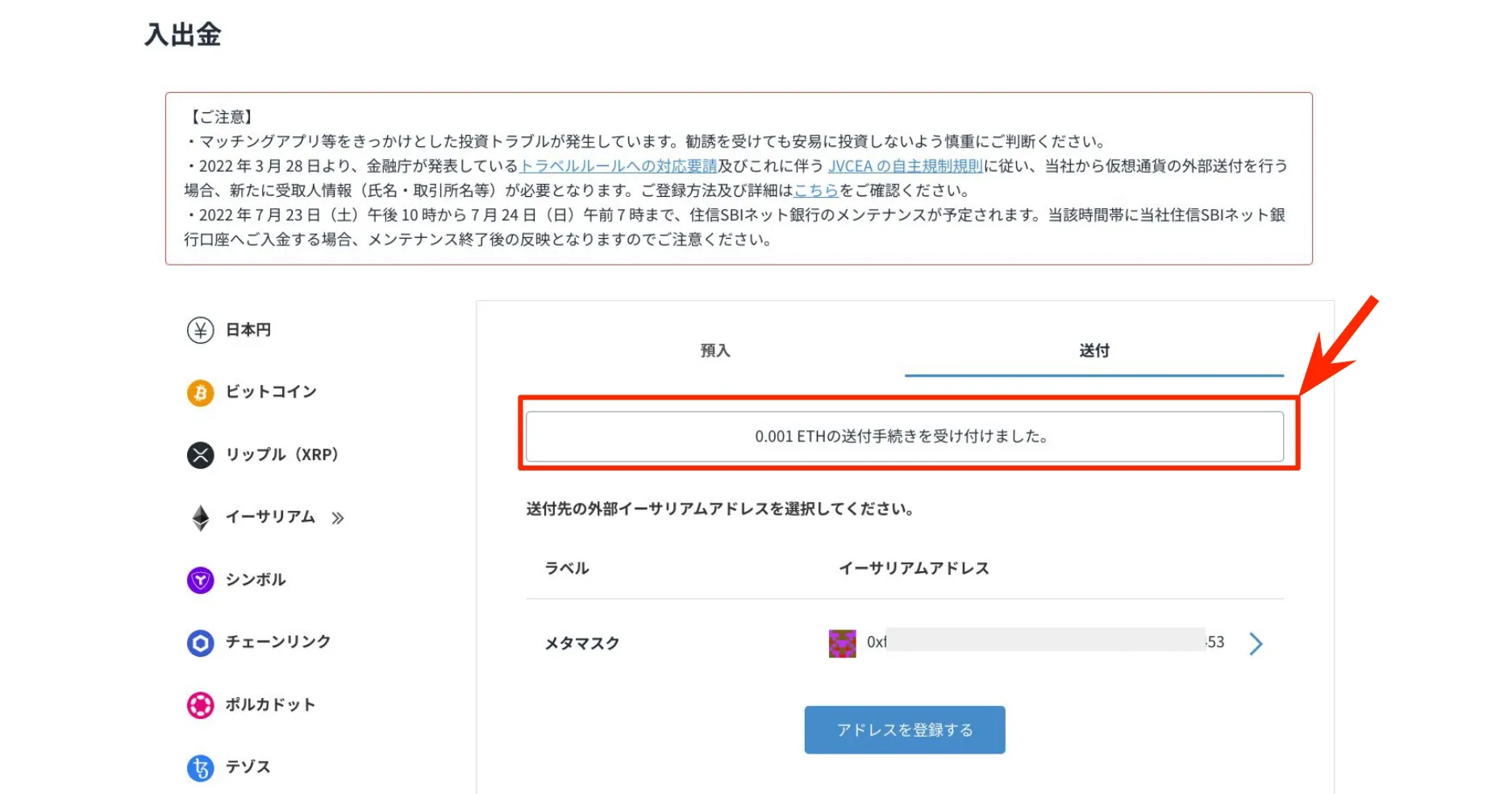 送金は一度に全額するのではなく、まずは少ない数量をテスト送金して、実際に送金されるかを確認しましょう。