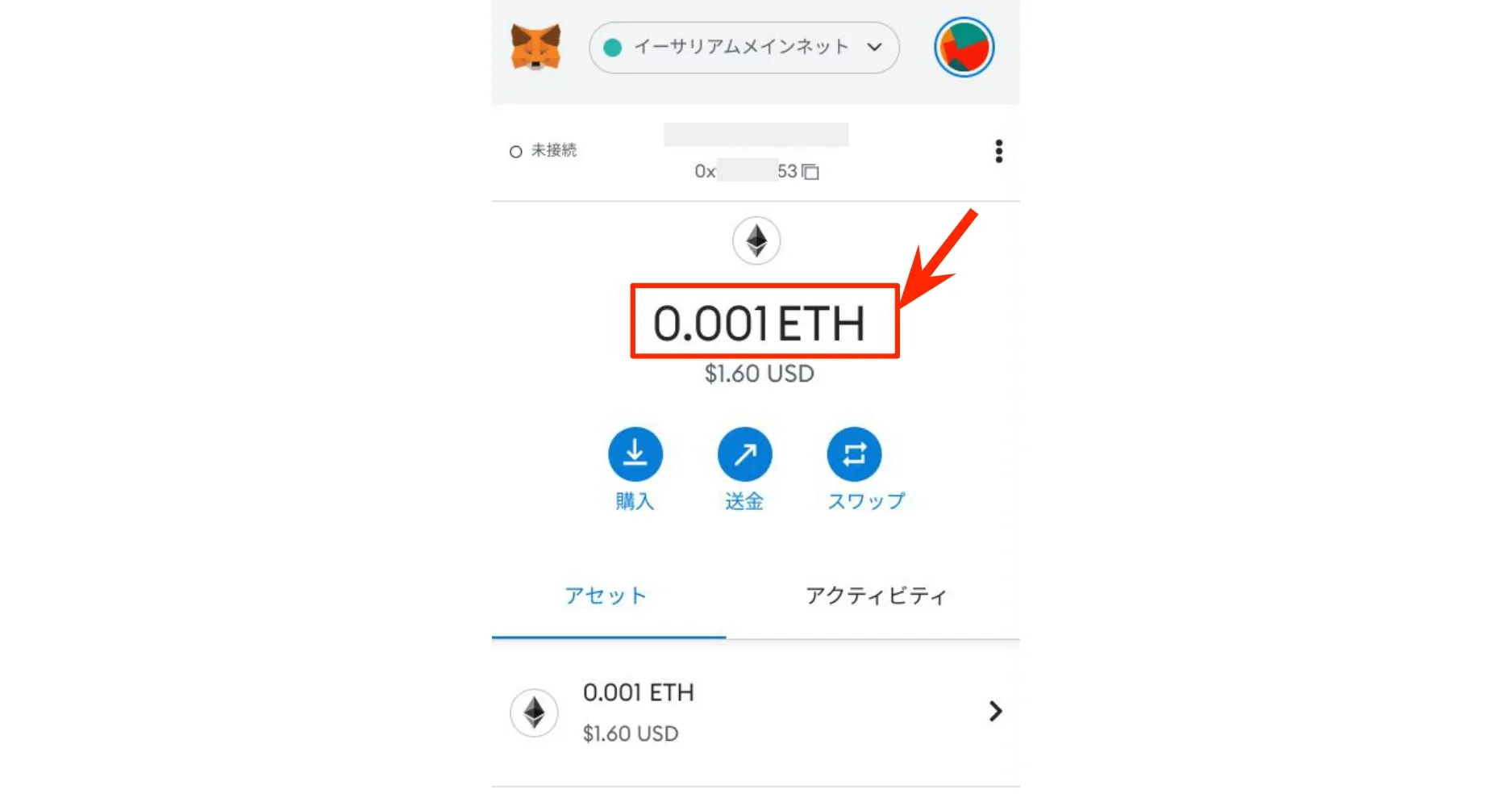しばらくするとメタマスクにイーサリアムが送金され、ウォレットで確認できます。