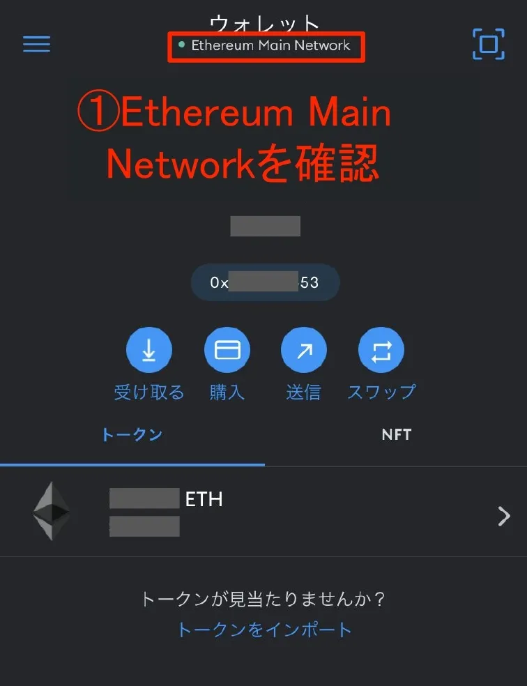 まず、メタマスクのアプリを起動して「Ethereum Main Network」になっているか確認します。