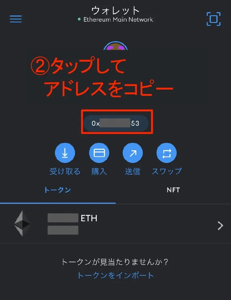 中央に表示されているウォレットアドレスをタップしてコピーします。
