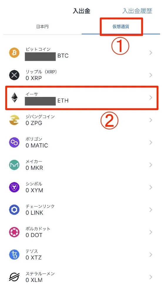 「①仮想通貨」を選択し、「②イーサ」をタップします。