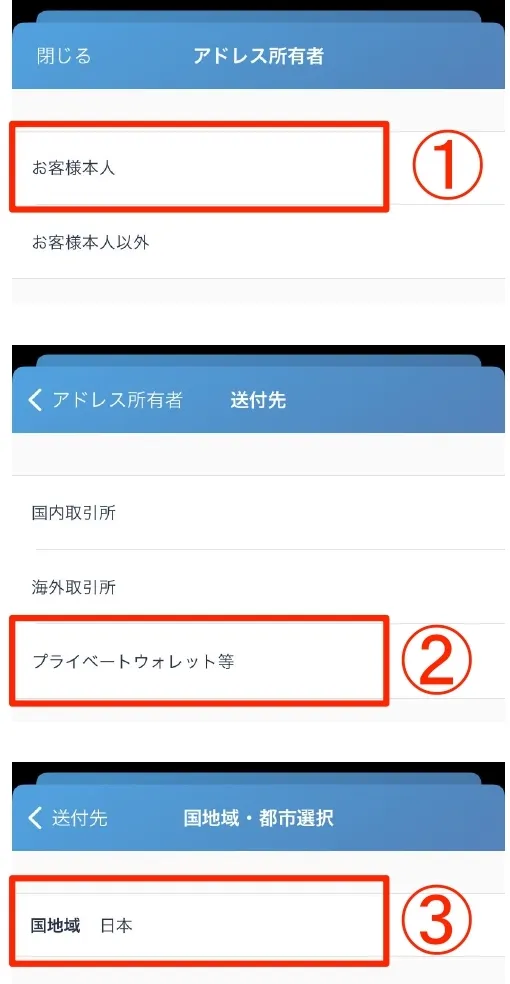 「①お客様本人」「②プライベートウォレット等」「③日本」を選択します。