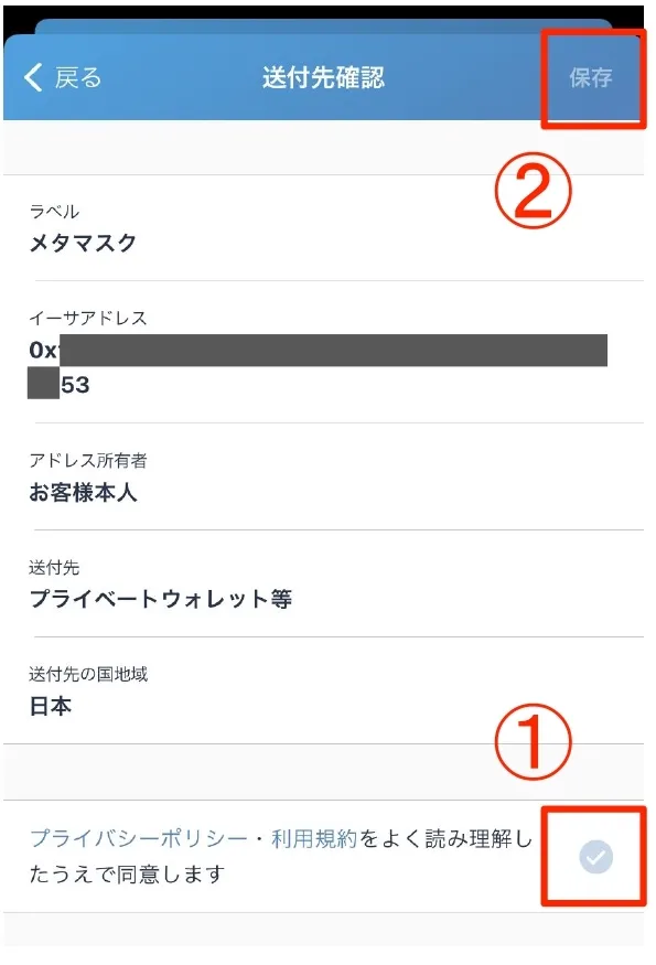 登録内容に間違いがなければ、「プライバシーポリシー・利用規約」をチェックして「保存」をタップしましょう。