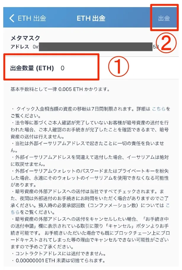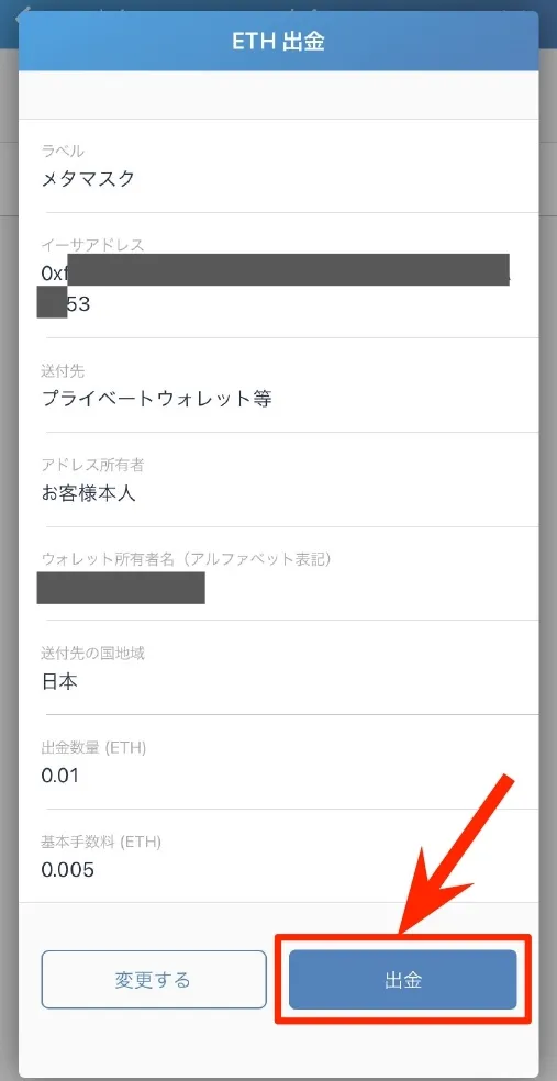 送金先、送金数量(手数料含む)に間違いがなければ「出金」をタップします。