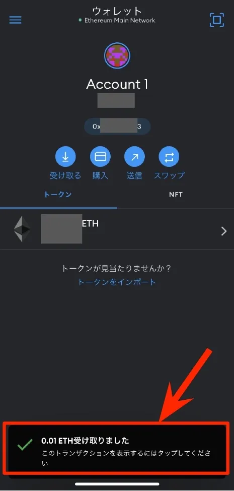 しばらくして、メタマスクのアプリを起動すると「0.01ETH(送金額)受け取りました」と表示されます。